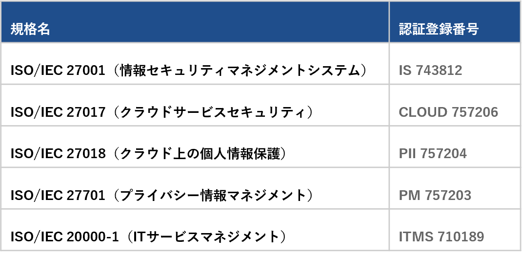 当社はISO認証5件を取得し、情報セキュリティ・プライバシー保護・クラウド運用・ITサービス品質の各領域で体系的な管理体制を整えています。